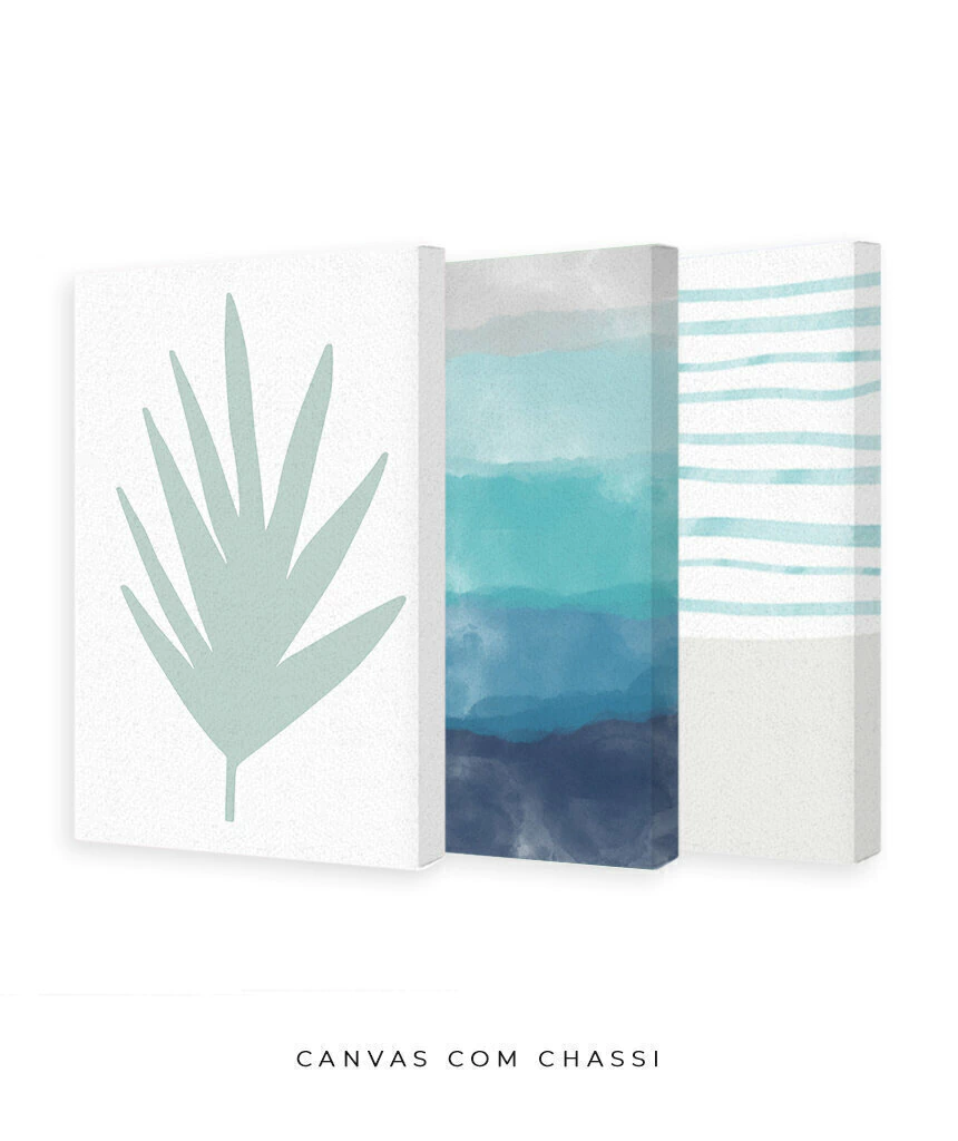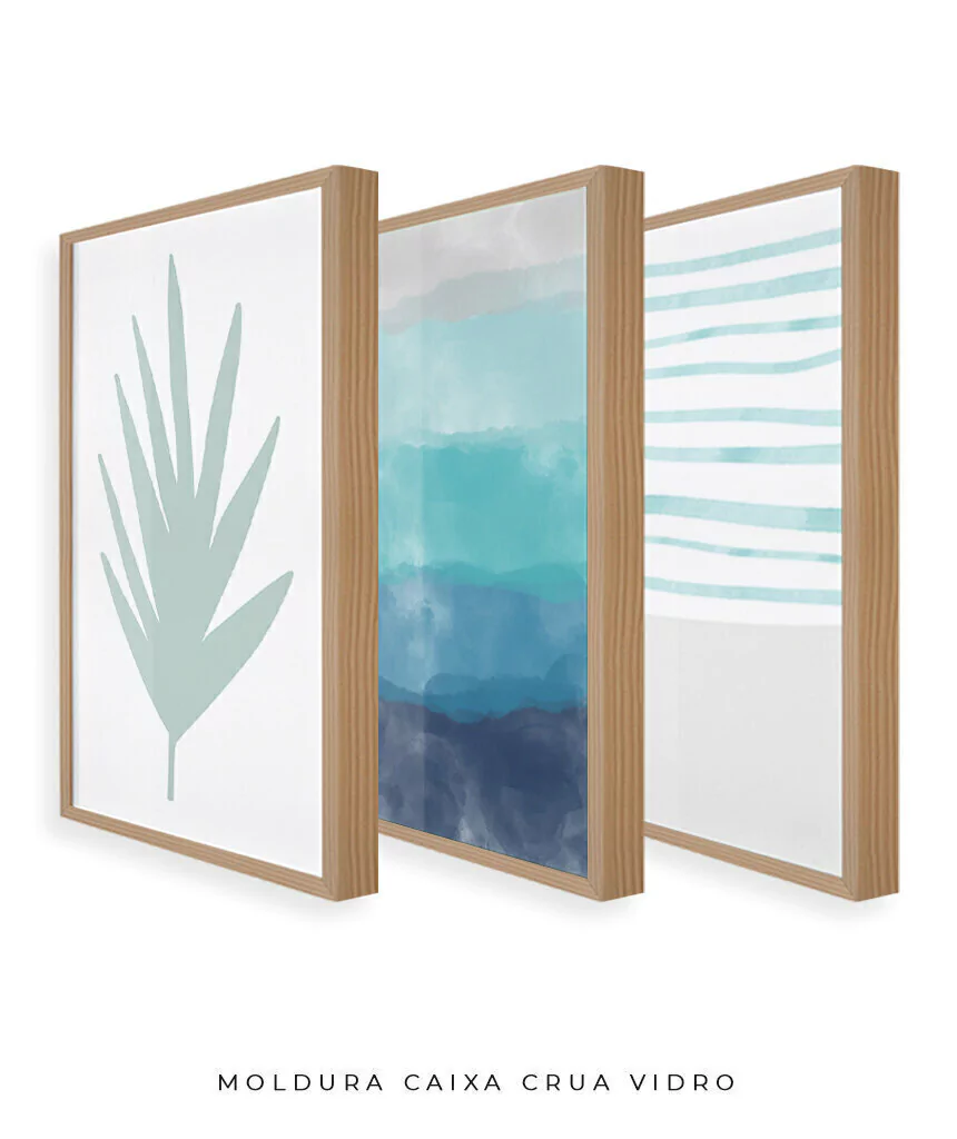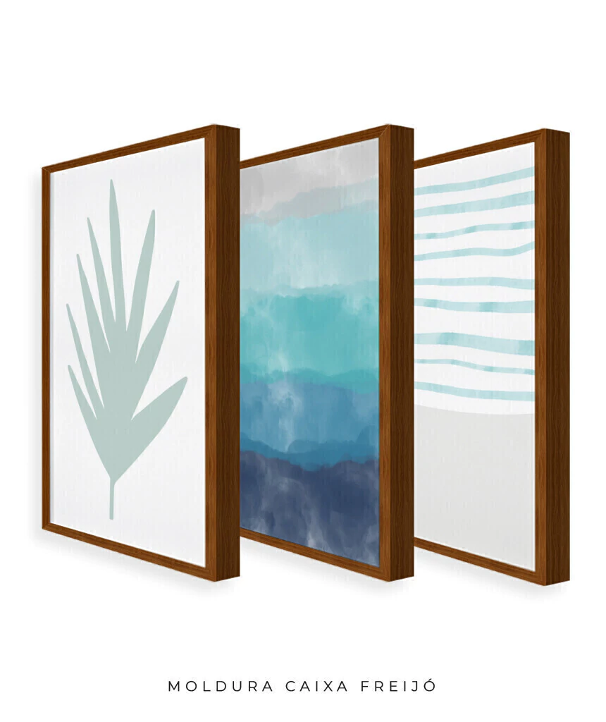 Conjunto com 3 Quadros Decorativos - Leaf + Aquarela Azul + Beach | Arte Autoral Por Rachel Moya | Art Studio®