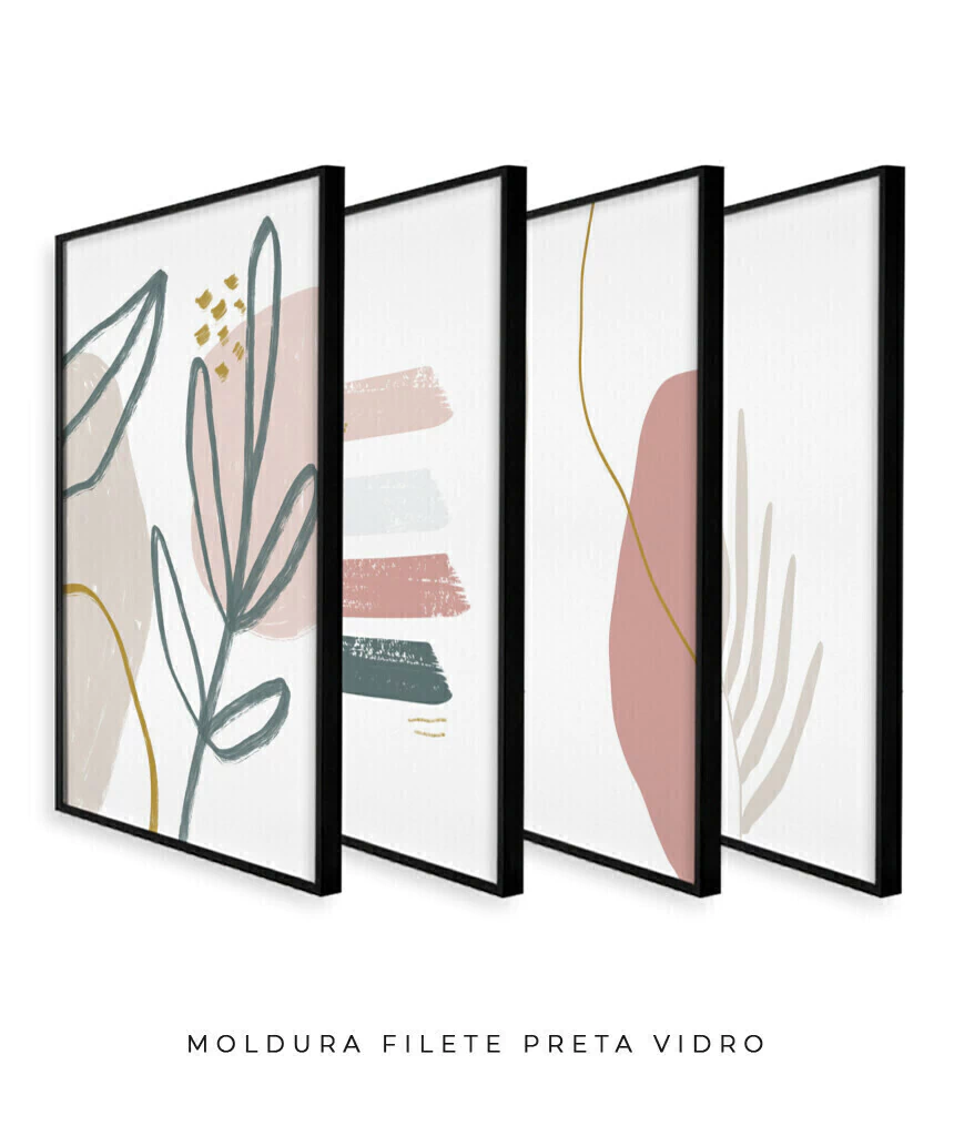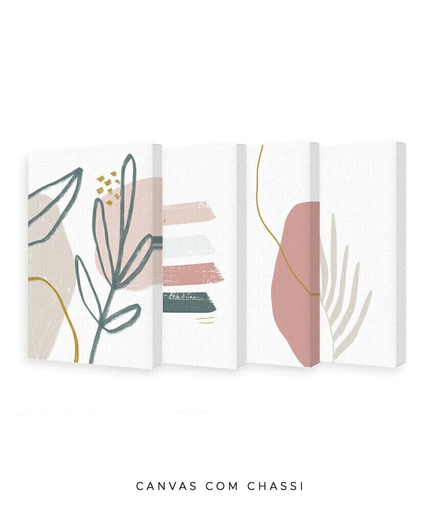 Conjunto com 4 Quadros Decorativos - Folhagem Boho + Pinceladas Spring + Nuances Minimal Rose e Bege + Leaf Minimal Bege | Arte Autoral Por Rachel Moya | Art Studio®