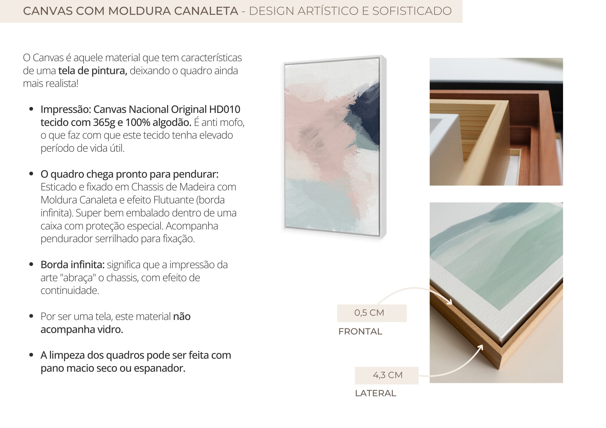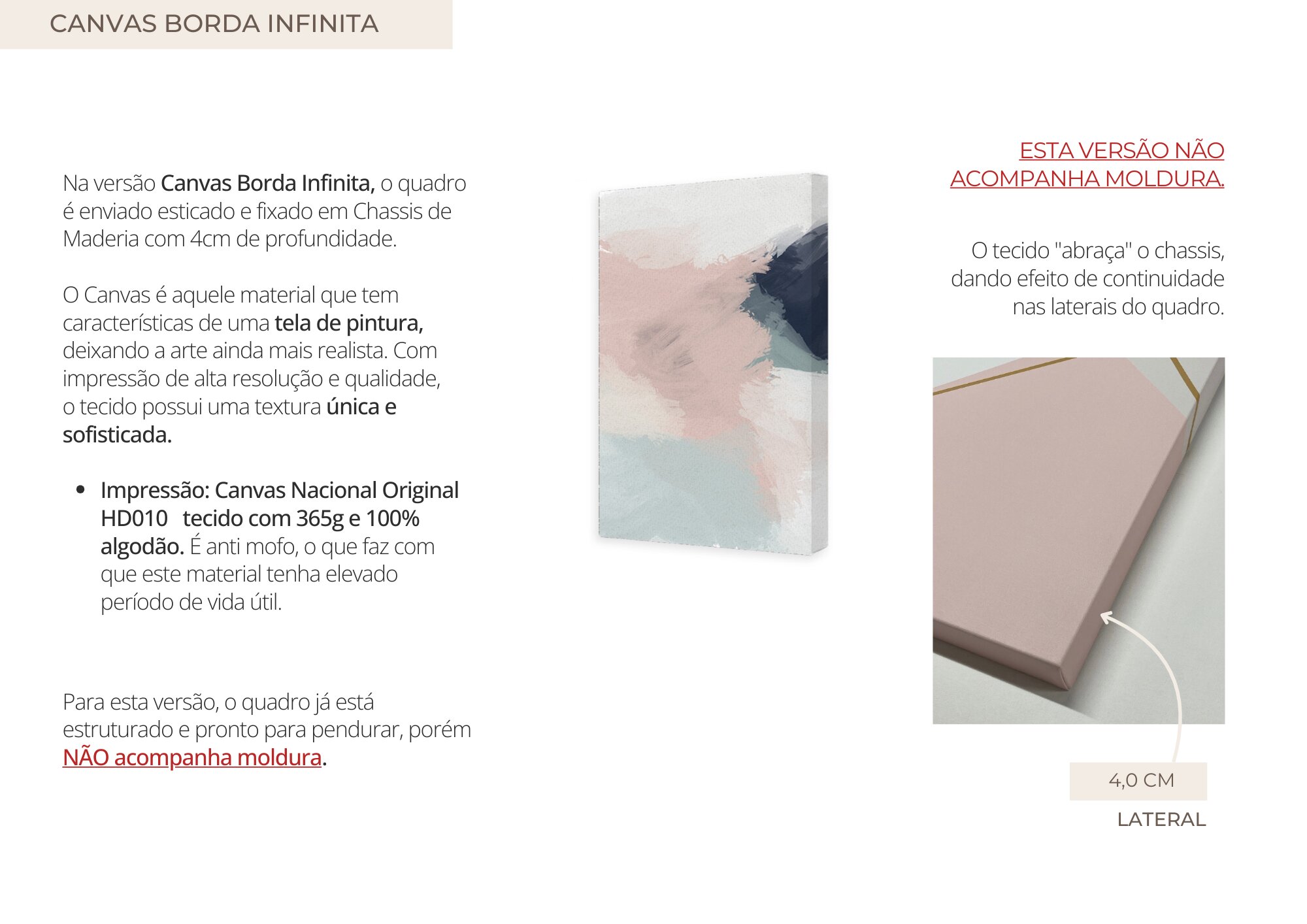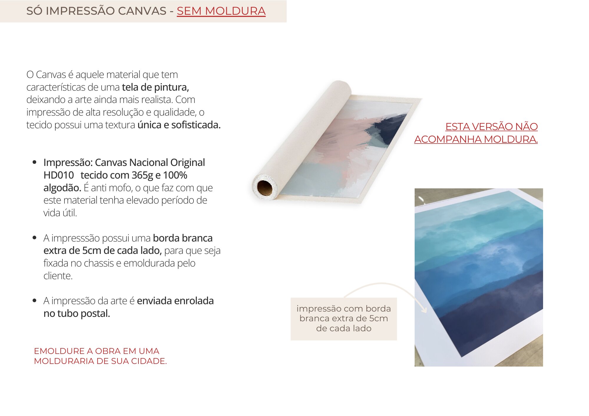 - O Material "Só Impressão Canvas" e "Canvas Borda Infinita" NÃO ACOMPANHAM MOLDURA (veja mais detalhes na descrição abaixo).