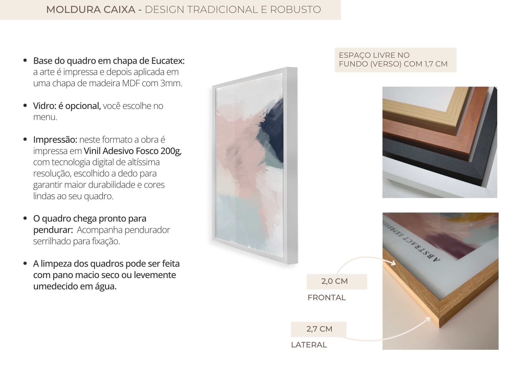 - Como cuidar do meu Quadro? - É muito simples! Evite impactos e efetue a manutenção e limpeza dos quadros regularmente. Faça a limpeza do seu quadro utilizando um pano macio seco ou espanador. Lembrando-se de nunca utilizar produtos químicos ou abrasivos.
