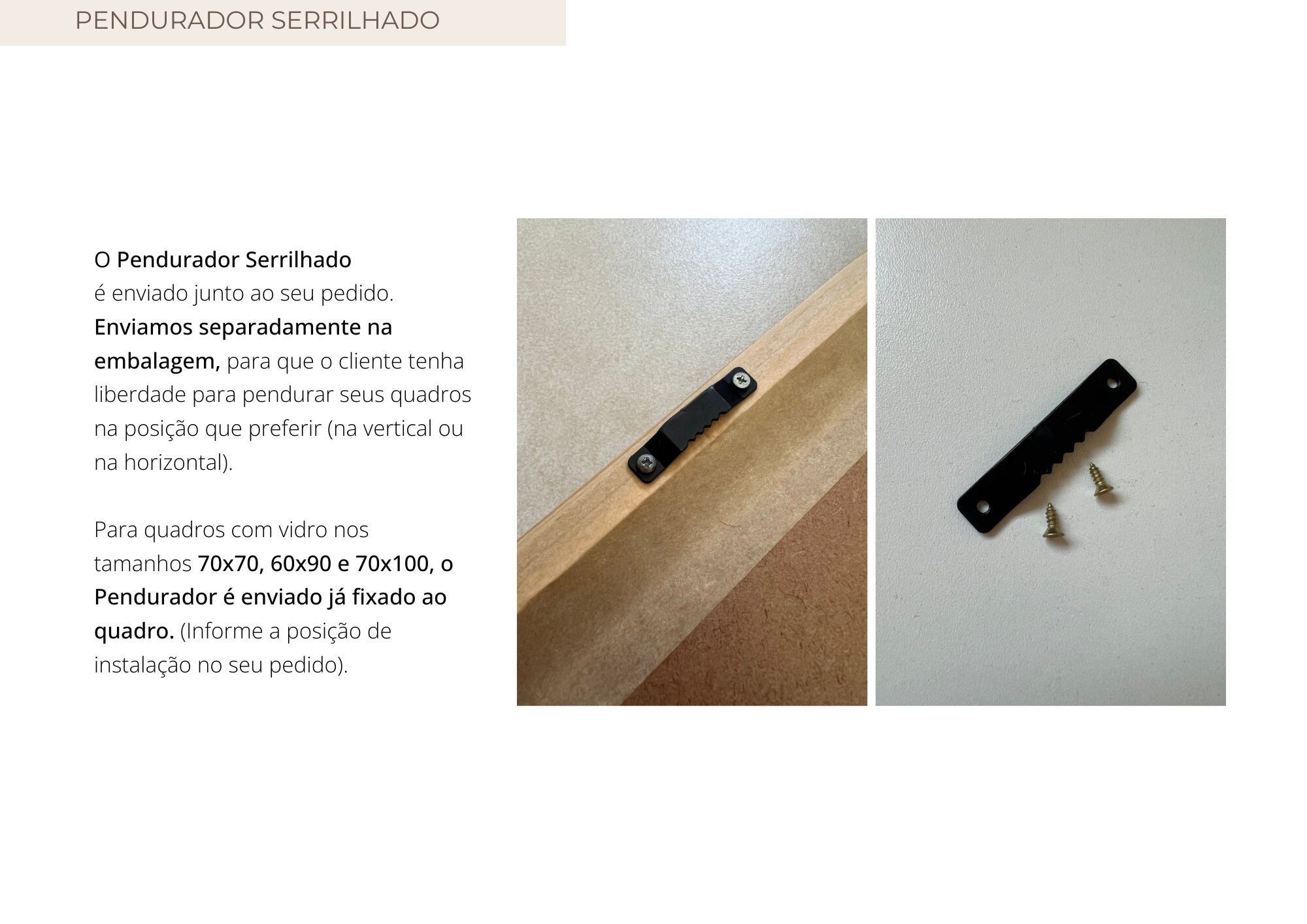 - Para os quadros nos tamanhos 70x70, 60x90 e 70x100 COM VIDRO, o pendurador é enviado fixado no quadro. Informe a posição da instalação no seu pedido;
