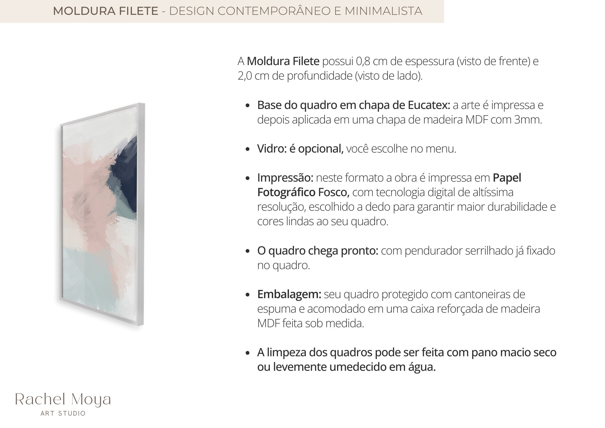 - Como cuidar do meu Quadro? - É muito simples! Evite impactos e efetue a manutenção e limpeza dos quadros regularmente. Faça a limpeza do seu quadro utilizando um pano macio seco ou espanador. Lembrando-se de nunca utilizar produtos químicos ou abrasivos.