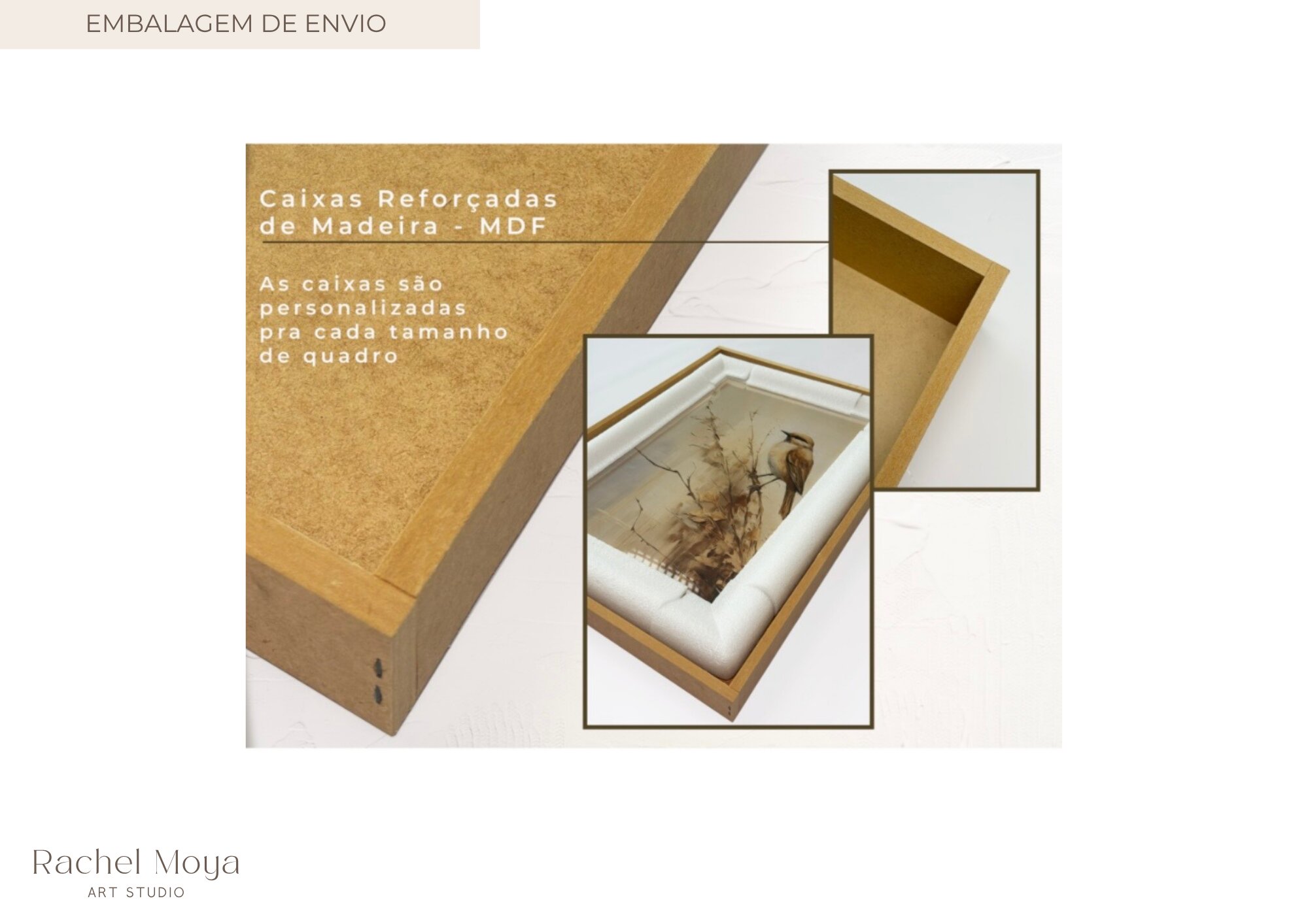- Como meu quadro será embalado? - O seu quadro é enviado com cantoneiras de espuma, lacrado dentro de uma caixa de madeira MDF.
