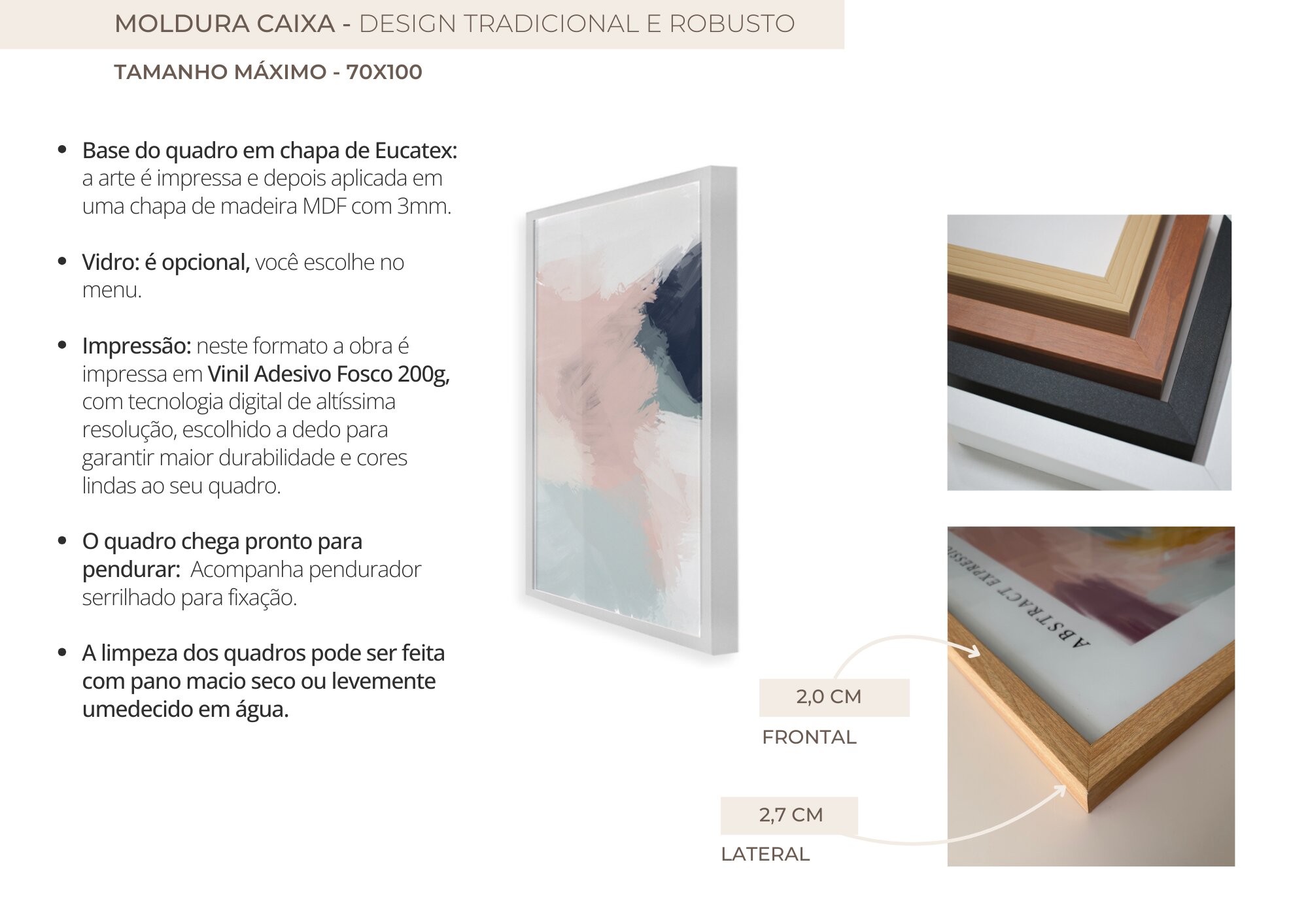 - Como cuidar do meu Quadro? - É muito simples! Evite impactos e efetue a manutenção e limpeza dos quadros regularmente. Faça a limpeza do seu quadro utilizando um pano macio seco ou espanador. Lembrando-se de nunca utilizar produtos químicos ou abrasivos.