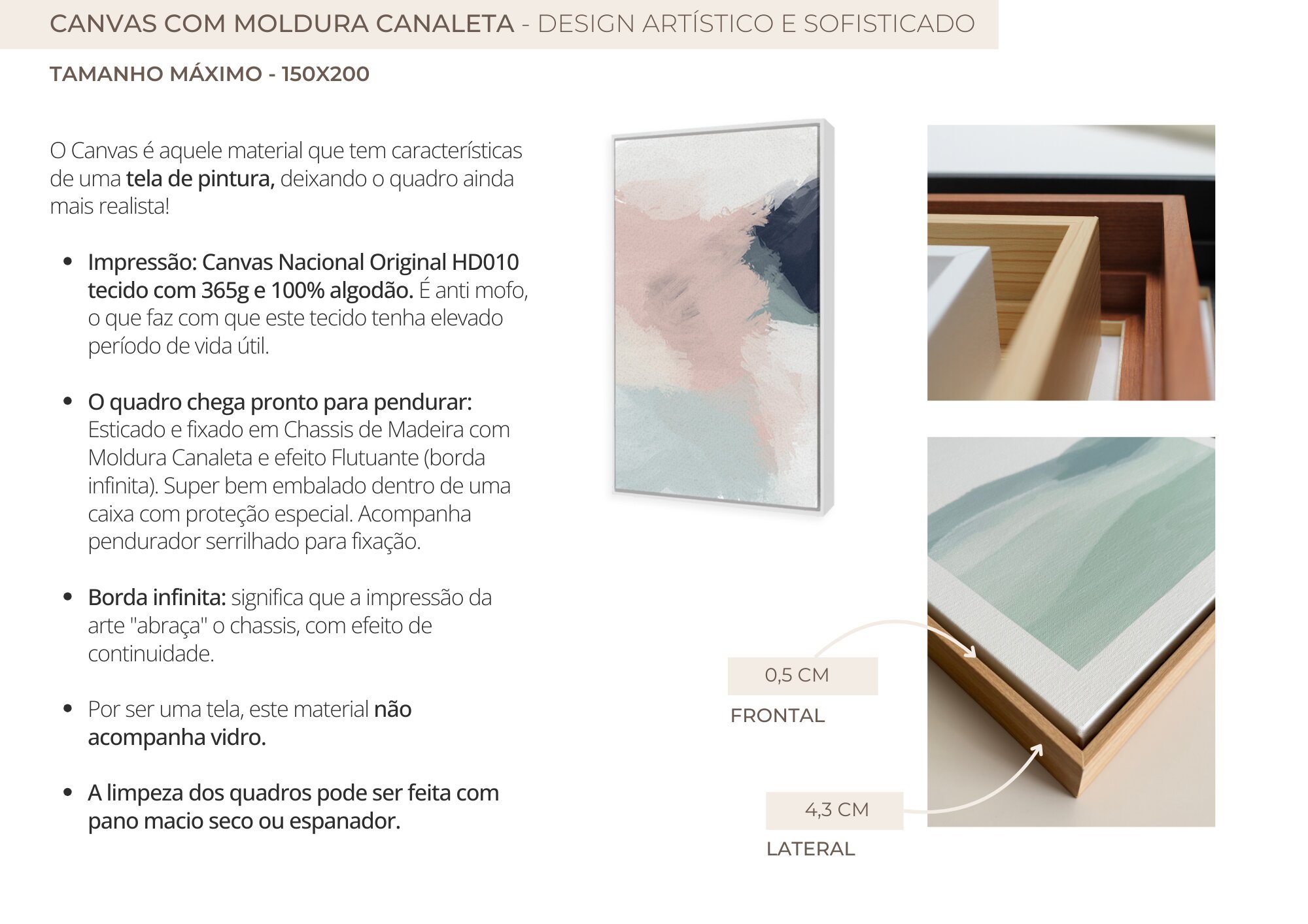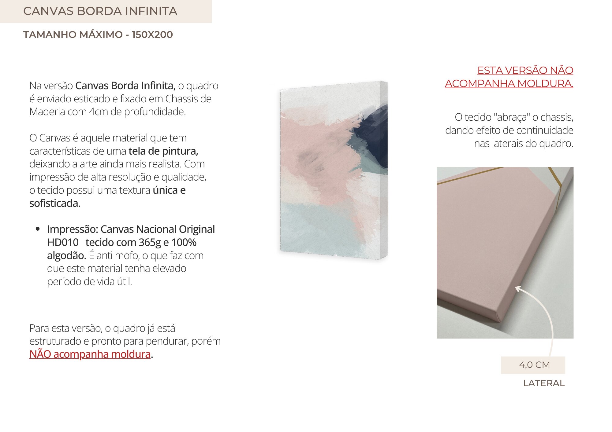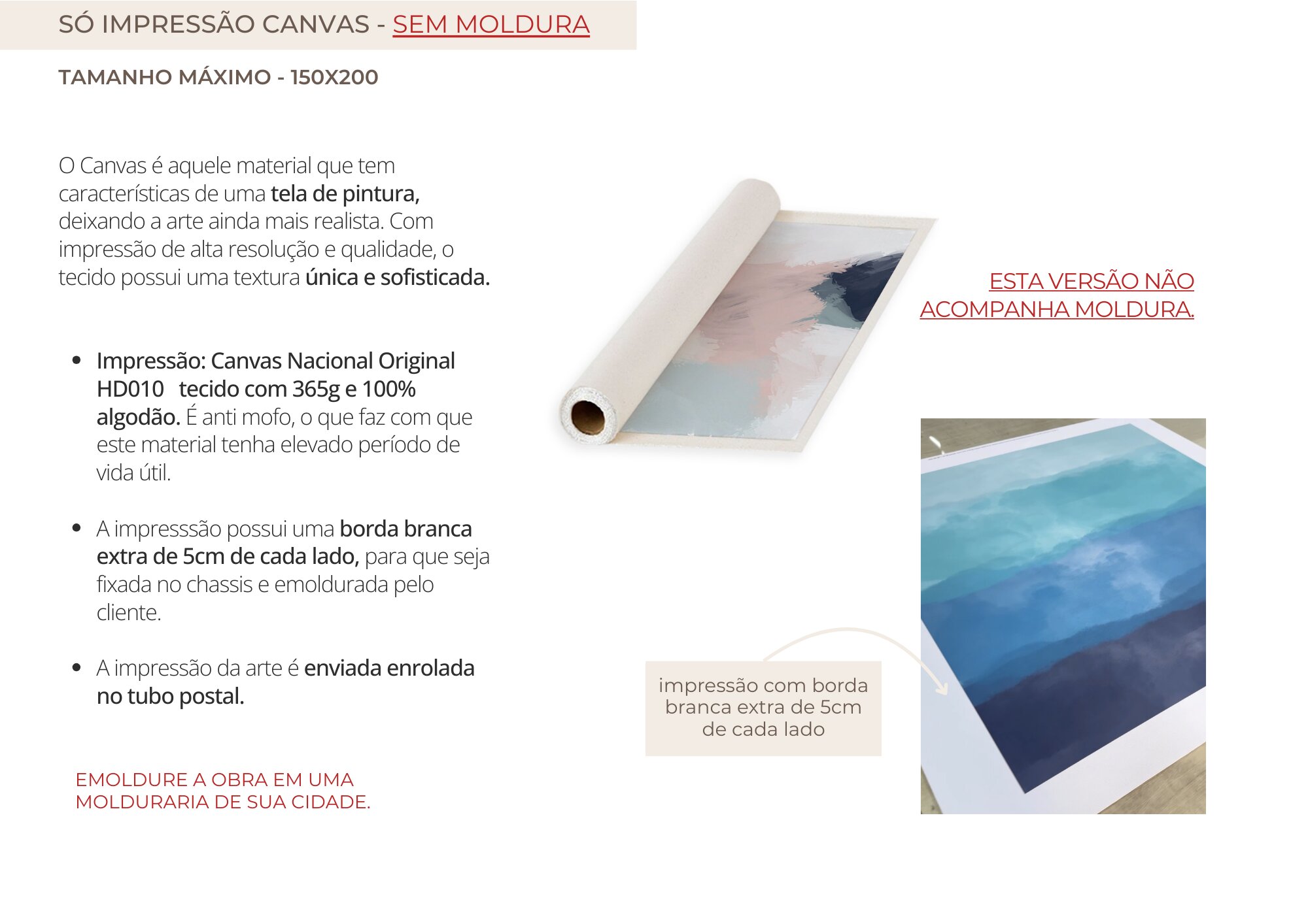 - O Material "Só Impressão Canvas" e "Canvas Borda Infinita" NÃO ACOMPANHAM MOLDURA (veja mais detalhes na descrição abaixo).