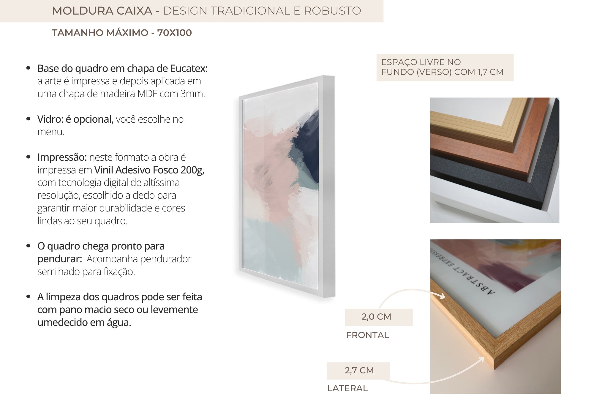 - Para os quadros nos tamanhos 70x70, 60x90 e 70x100 COM VIDRO, o pendurador é enviado fixado no quadro. Informe a posição da instalação no seu pedido;